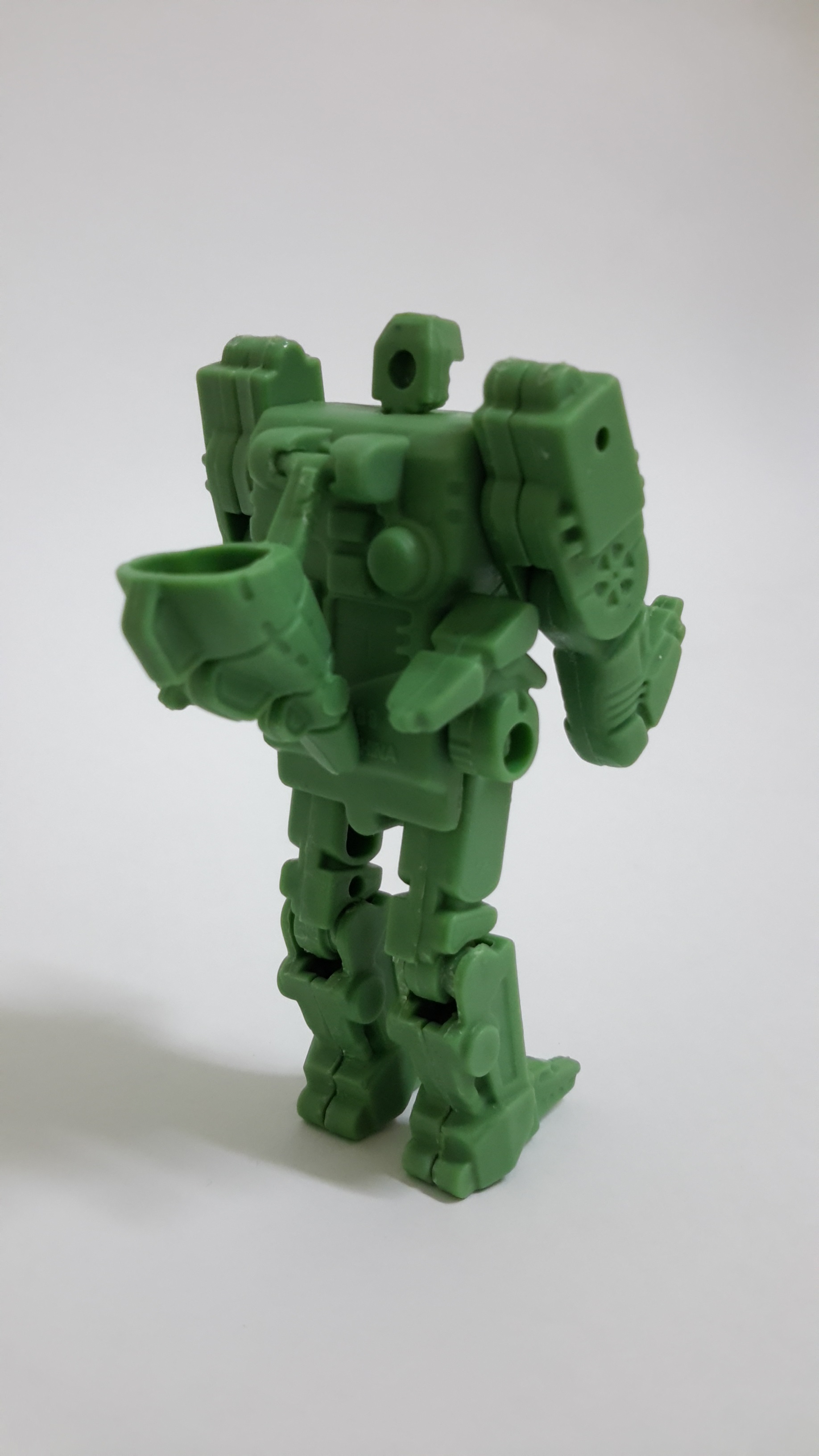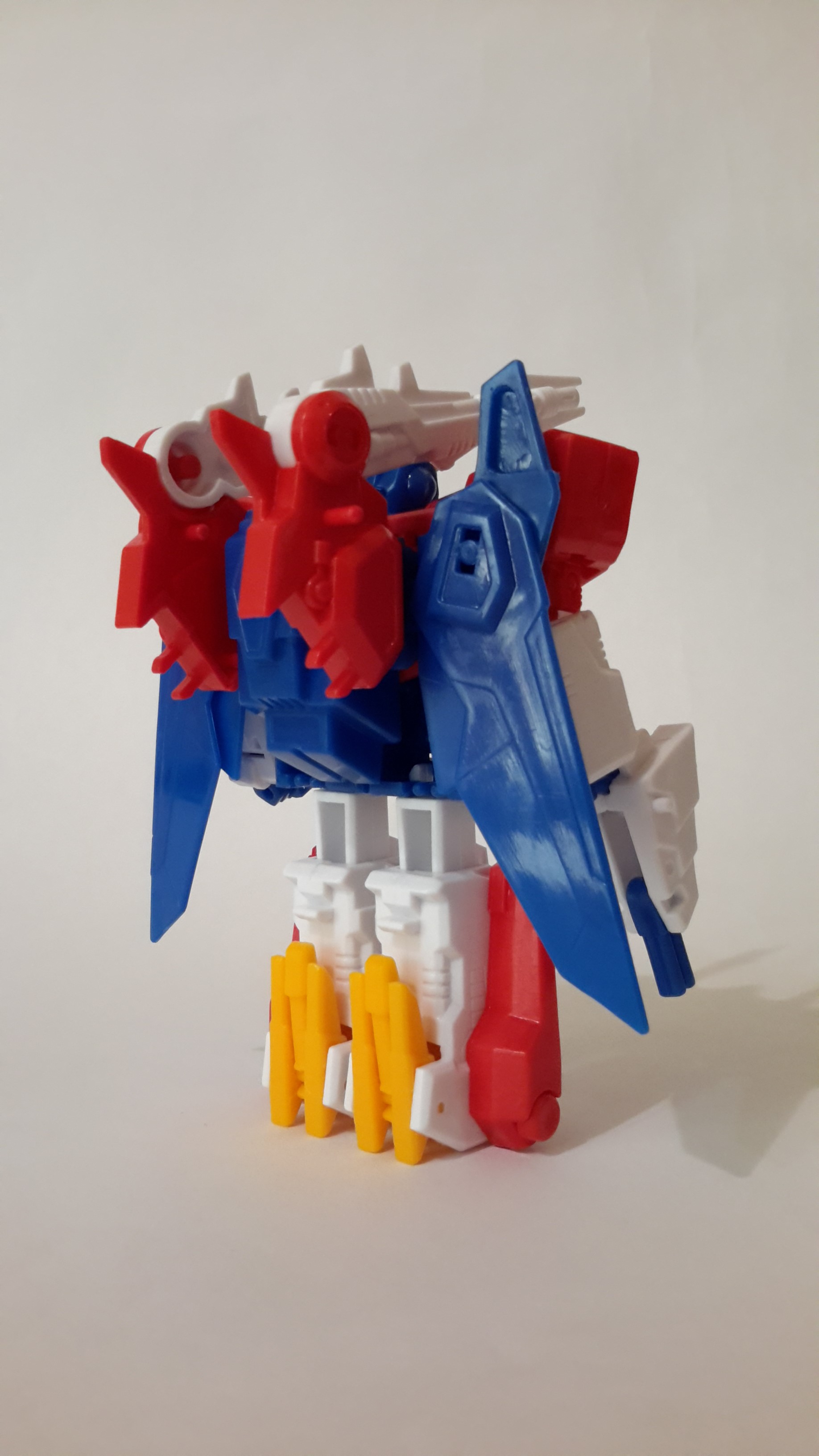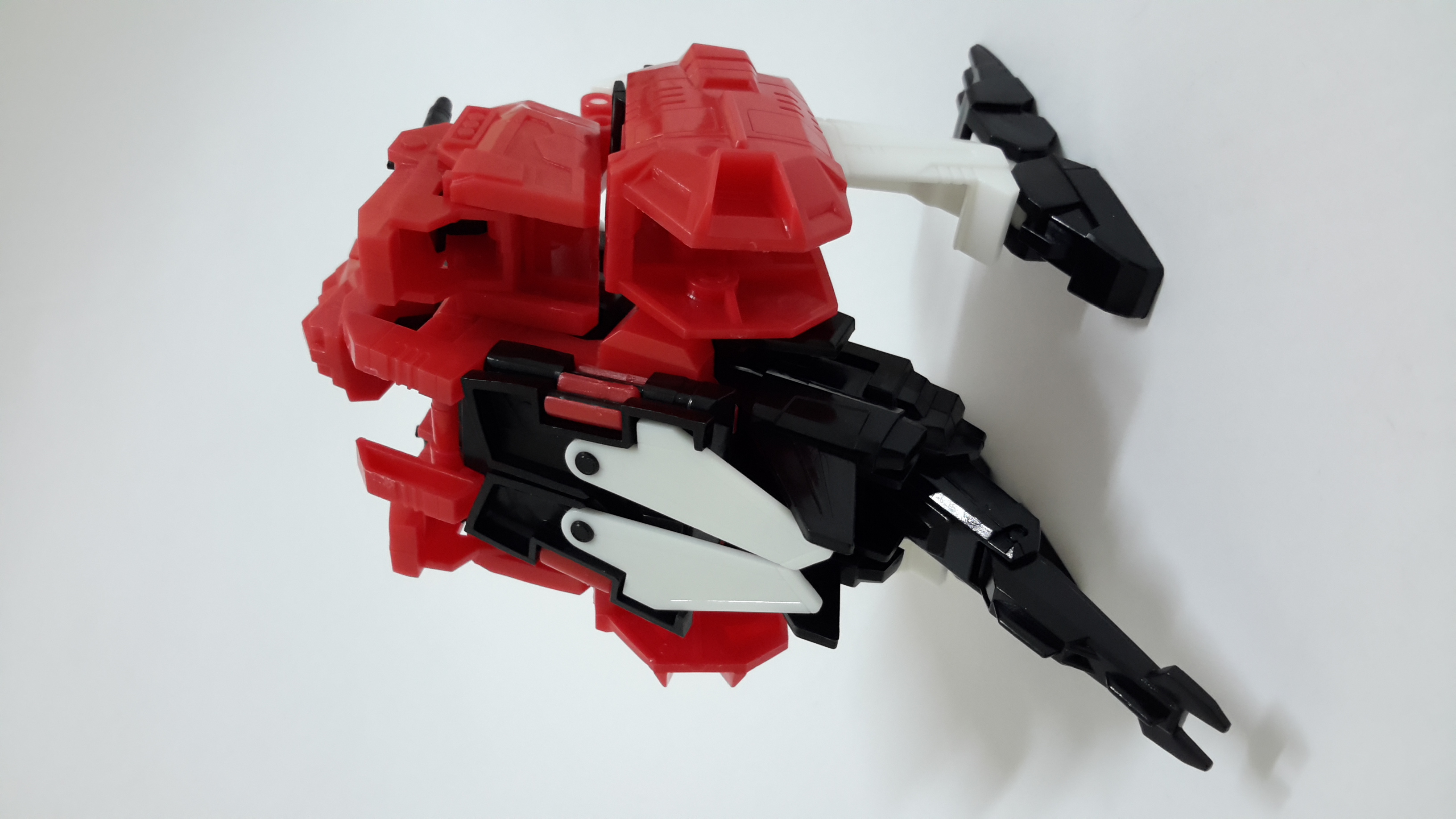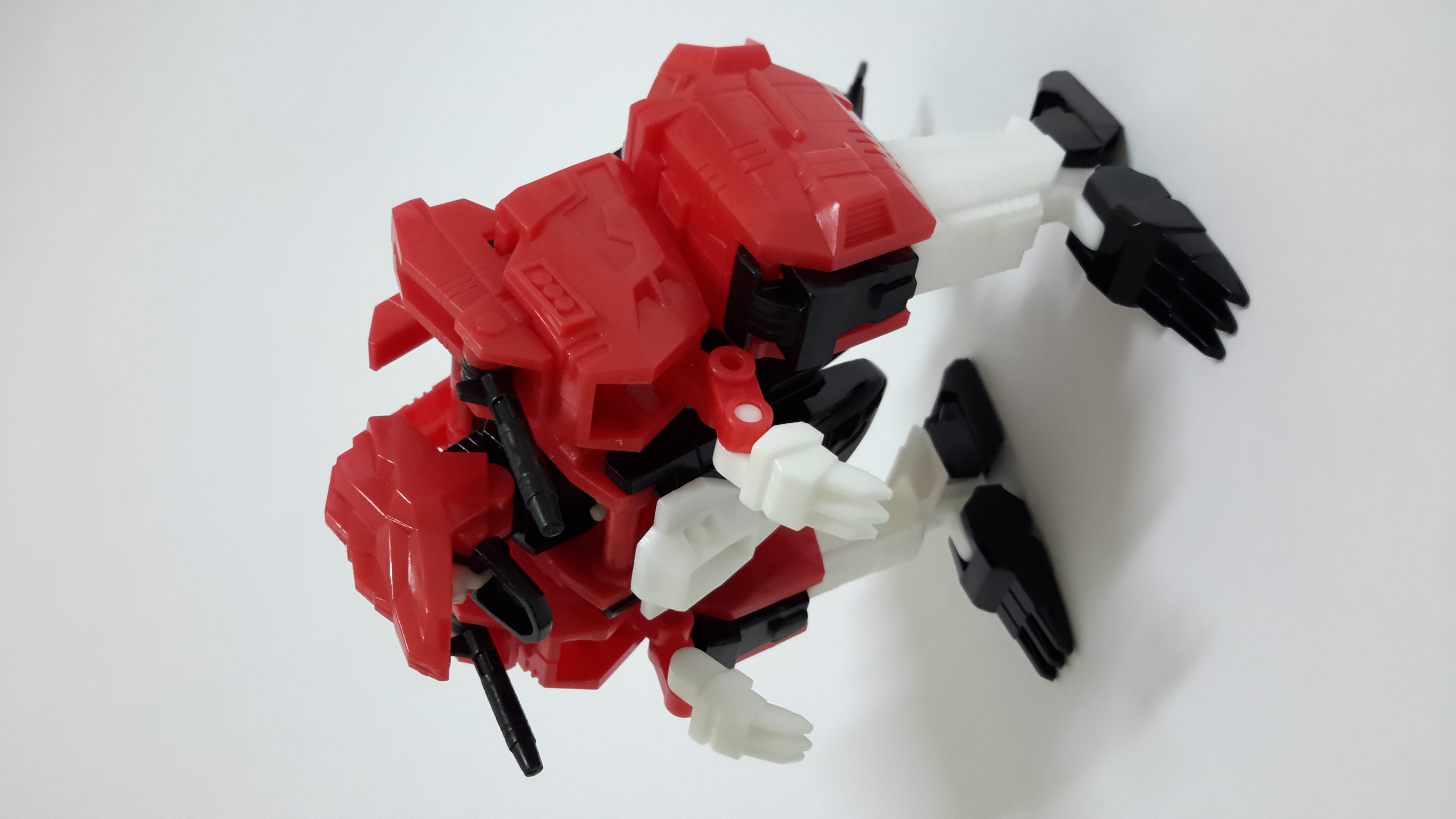 〔模型介紹〕新版食玩雖然需要拆解變形,但外型氣勢上勝於舊版,巨獸型態下的翅膀及尾巴刻劃得細膩逼真。變形時將獸頭向前扳露出頭部,將下肢拆下裝至上方變成手臂,翻轉腹部變成腳,而新版最棒的特點在於胸前的鳥獸可分體與變形,且能完全收納於胸口裡頭,另外還能變成手上的武器,完整還原動畫的設計!