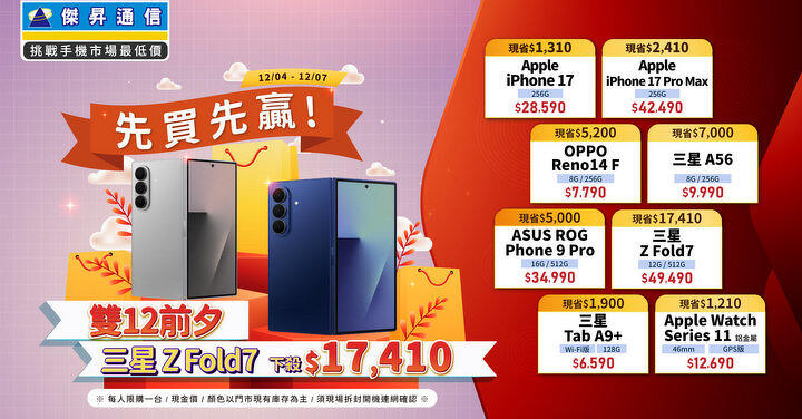 正式進入年末消費旺季,不管是電商平台瘋狂洗版,到百貨年終慶每天倒數,人人都在比誰折扣更狂。傑昇通信雙 12 接力開跑,把手機、平板的優惠直接開到最大,不僅有蘋果 iPhone 17、17 Pro Max 最高現折 2,410 元回饋果粉,還有三星熱銷摺疊旗艦 Galaxy Z Fold7 及國民機 A56,活動期間至全台傑昇通信門市購買,直接用 59 折起的佛心價入手,讓消費者先買先贏!