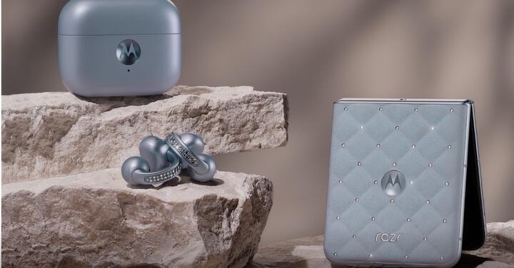 razr 60 冰藍限定版,更將時尚延伸至配件,精美盒裝內含聯名款 razr 60 手機、moto Buds Loop 開放式耳機、專屬手機保護殼與背繩。耳機外型與手機冰藍設計相互呼應,並飾以 Swarovski 水晶點綴,由 Bose 提供音效技術調校,打造視覺與聽覺的雙重饗宴。