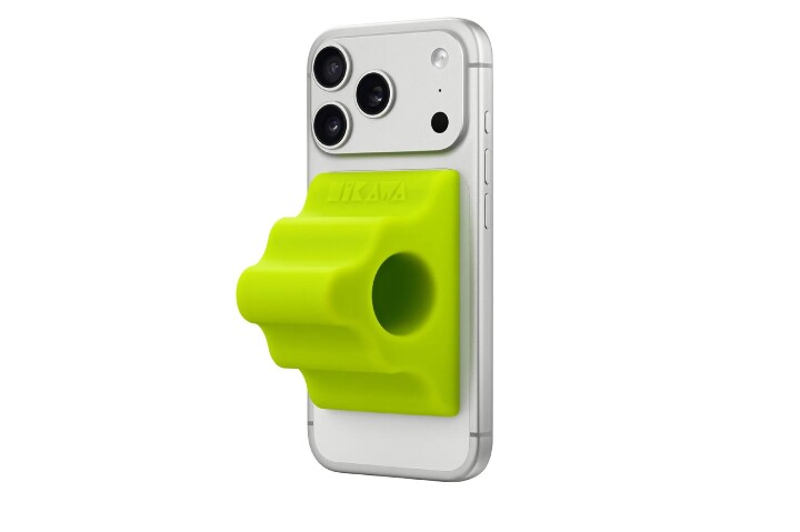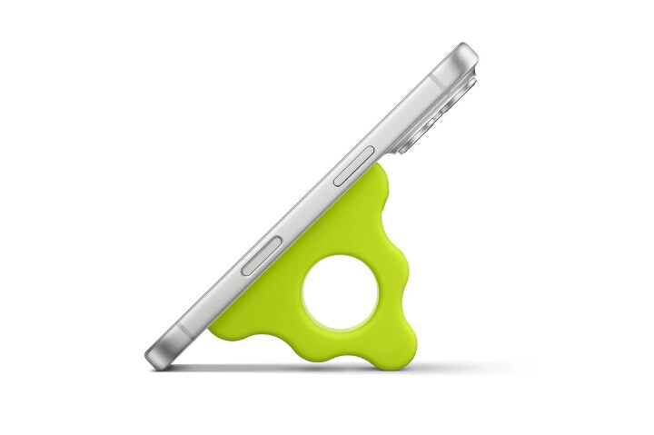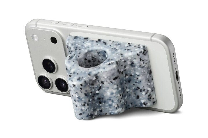這款握把採用柔軟矽膠材質,可透過 MagSafe 吸附於 iPhone 背面,平時作為手機握把,放置桌面即可化身橫向或直向立架。Apple 表示,產品從設計初期就納入手部肌力、靈巧度或控制能力受限使用者的意見,目的在降低操作負擔、提升握持穩定度。外觀方面,Apple 提供 Brat 綠與斑點石紋兩款配色;Hikawa 自家網站則另售藍色與混色「blurple」版本。