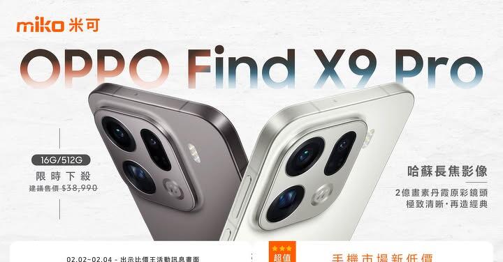 想入手 OPPO Find X9 Pro 體驗大師級的人像攝影?全台最大連鎖通訊品牌 miko 米可手機館 祭出 OPPO Find X9 Pro (16G/512G) 限時優惠。不用問、不用等,保證現貨、保證空機、保證全新。只要出示比價王活動頁面,就能享有獨家驚喜價!