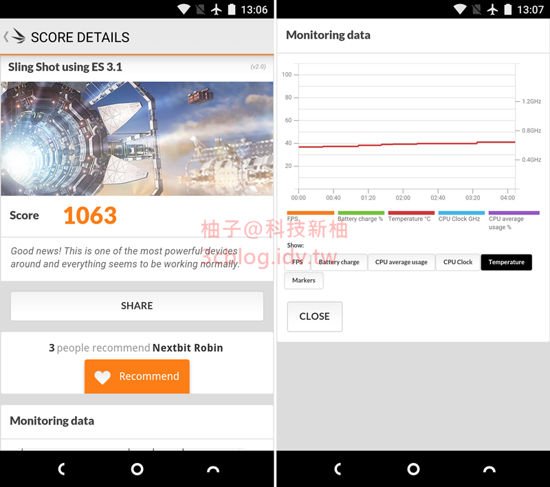 ▲ 以 3D Mark 實測 Sling Shot ES 3.1 的成績為 1063 分(圖左);溫度表現維持 40 度左右(圖右),不過實際在同步時,觸摸背後雲朵圖案會感受到溫溫的。
