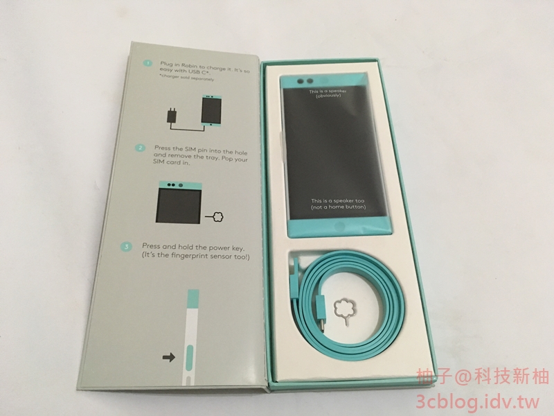 ▲ 盒子打開來,左邊是簡介摺頁,右邊則放了手機、Type-C 與退卡針。
