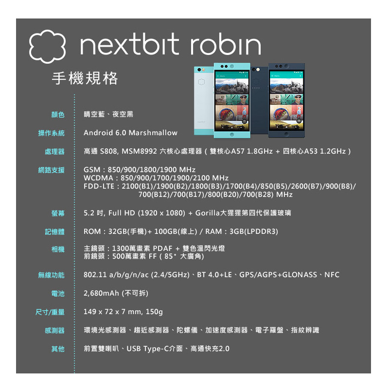 ▲ Nextbit Robin 主要規格為 Snapdragon 808 6 核心、3 GB 記憶體、32 GB儲存空間+100GB 雲端儲存空間,支援 Quick Charge 2.0 快速充電。