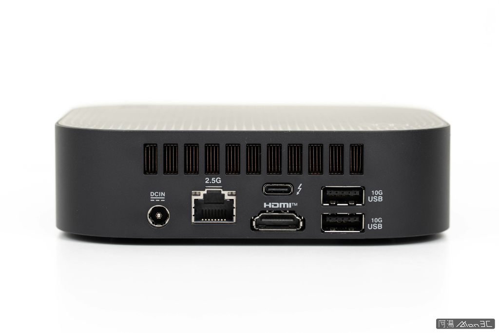 背面同樣由左至右是電源接口、2.5GbE RJ-45 網路孔、Thunderbolt 4、HDMI 2.1 TMDS(非完整版 HDMI 2.1)和兩個 10Gbps 的 USB 3.2 Gen2 Type-A。