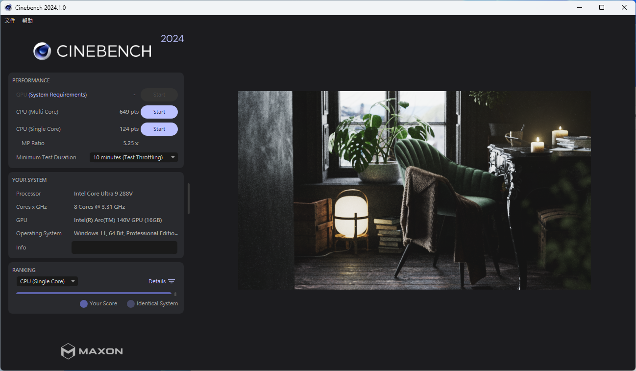 最後,來點例行性的跑分。首先看到 CPU 的部分,ASUS NUC 14 Pro AI 搭載的是 Intel Ultra 9 288V Lunar Lake 處理器,有 4 顆 P-core 和 4 顆 E-core,再搭配有著 8 顆 Xe 核心的 Arc 140V GPU,以台積電 N3B 製程打造。搭配 32GB LPDDR5x-8533 雙通道記憶體,於 Cinebench R23 單核得分 1,726,多核 9,184 。