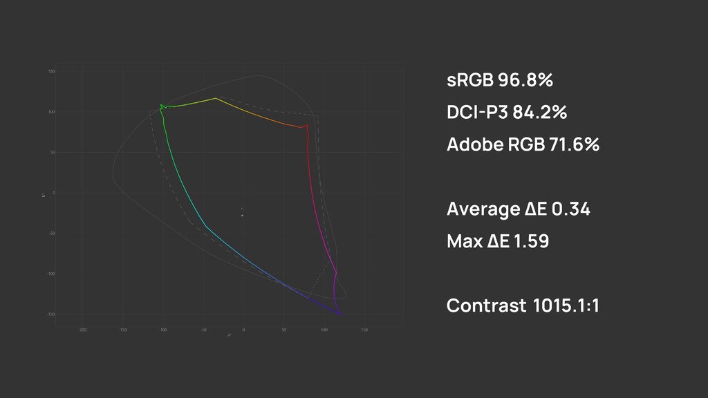 在色域表現上,官方標示 DCI-P3 93%。於 150 nits 亮度下實測,可達到 84.2% DCI-P3 與 96.8% sRGB 色域覆蓋。色準表現同樣出色,平均 ΔE 僅 0.34,最大 ΔE 為 1.59。
