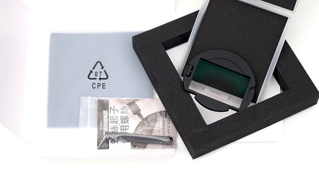 由於預計裝在 Canon RF 系統內,所以選購時要選擇對應型號的內置型濾鏡。開箱後可以看到,內置型濾鏡本體,四周有塑膠框架,可以固定在 Canon RF 機身內,置於鏡頭與 CMOS 之間。